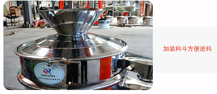 粗砂糖振動(dòng)篩細(xì)節(jié):料斗,大漢機(jī)械廠家標(biāo)識(shí),防塵蓋,出料口,振動(dòng)彈簧,大束環(huán)等。
