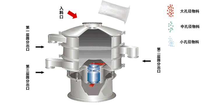 該產品的篩框為方形,主要振動源于振動電機,振動電機的上下兩端的偏心塊,可以隨振幅的大小進行調整角度。偏心塊的角度越大激振力就越大。物料隨著激振力的作用在篩網上做拋物線式的向前運動,從而實現物料的篩分與除雜的目的。